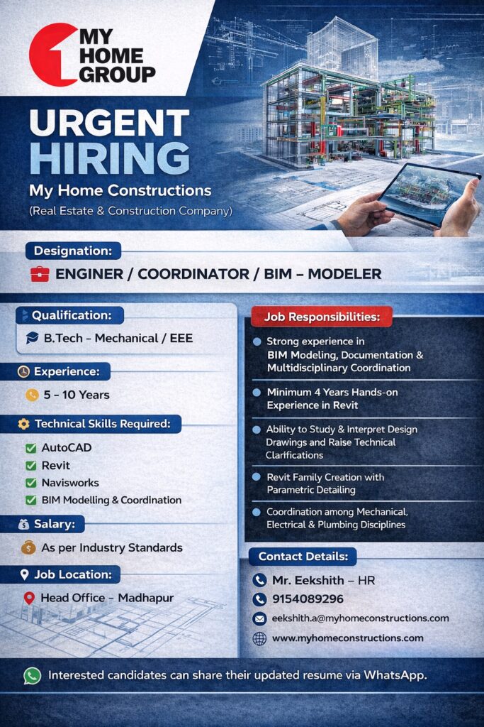 Ref ID: CJH-HR-75 My Home Constructions (Real Estate & Construction Company) is hiring experienced professionals for their Head Office in