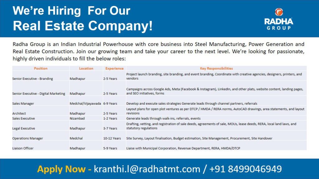 Source: CJH-HR-VerifiedPosted on: 09-01-2026Department: Operations Team 🏢 Project Rajapushpa ImperiaRajapushpa Lifestyle City, Tellapur – Hyderabad(Completed Flagship Residential Project) Rajapushpa Properties