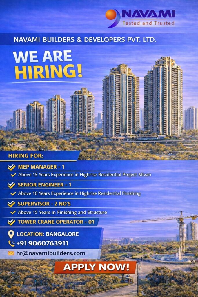 Company Name:Navami Builders & Developers Pvt. Ltd. Project Type:High-Rise Residential Projects (Mivan Construction) Job Location:Bangalore, Karnataka πΉ Open Positions 1οΈβ£