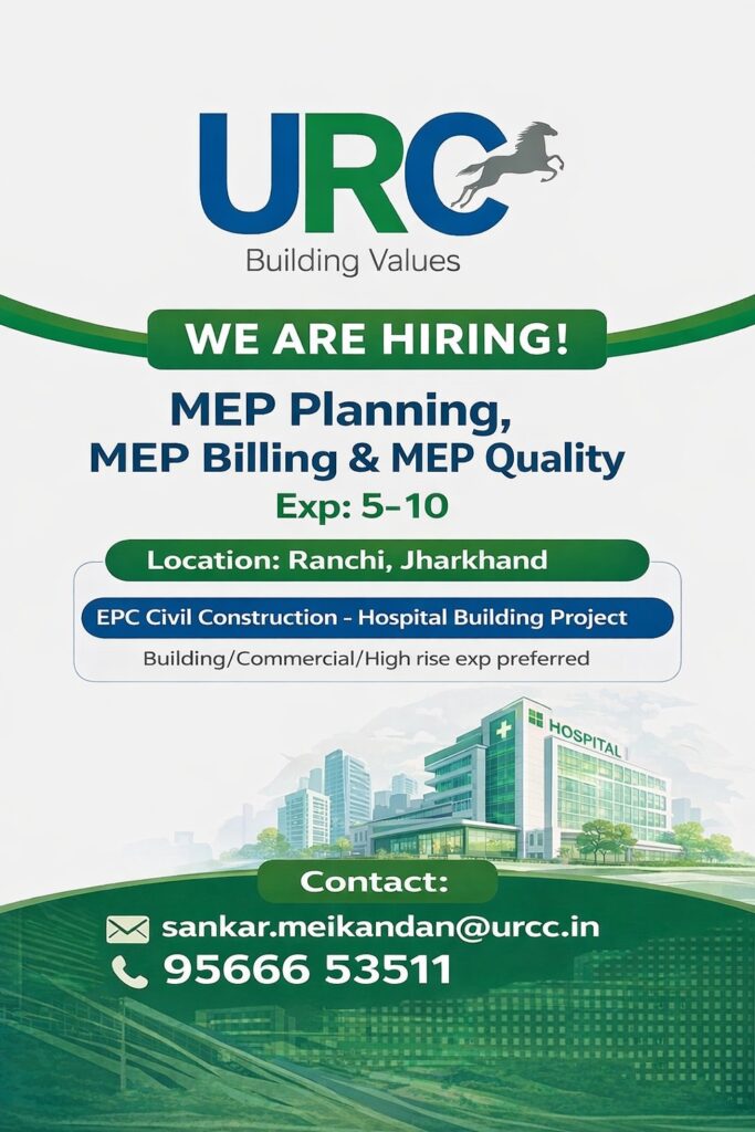 Company Name:URC Construction Pvt Ltd Project Type:EPC Civil Construction β Hospital Building Project Job Location:Ranchi, Jharkhand πΉ Open Positions 1οΈβ£