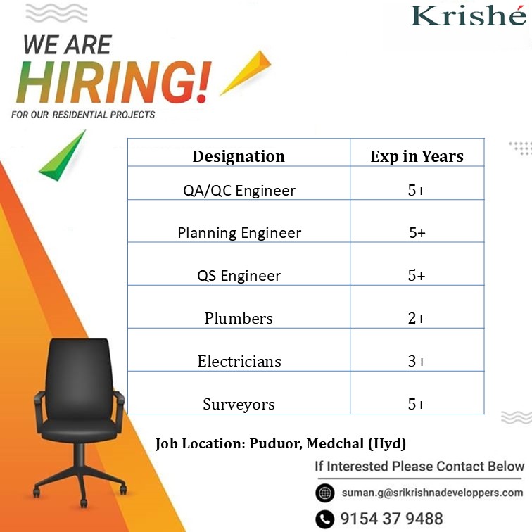 π’ Company Name Sri Krishna Developers (KrishΓ©) ποΈ Project Type Residential Construction Projects π Job Location Pudoor, Medchal, Hyderabad, Telangana
