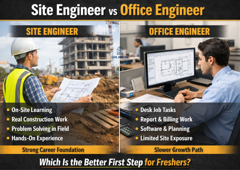 One of the most common questions freshers ask is:“Should I start as a site engineer or office engineer?” This decision