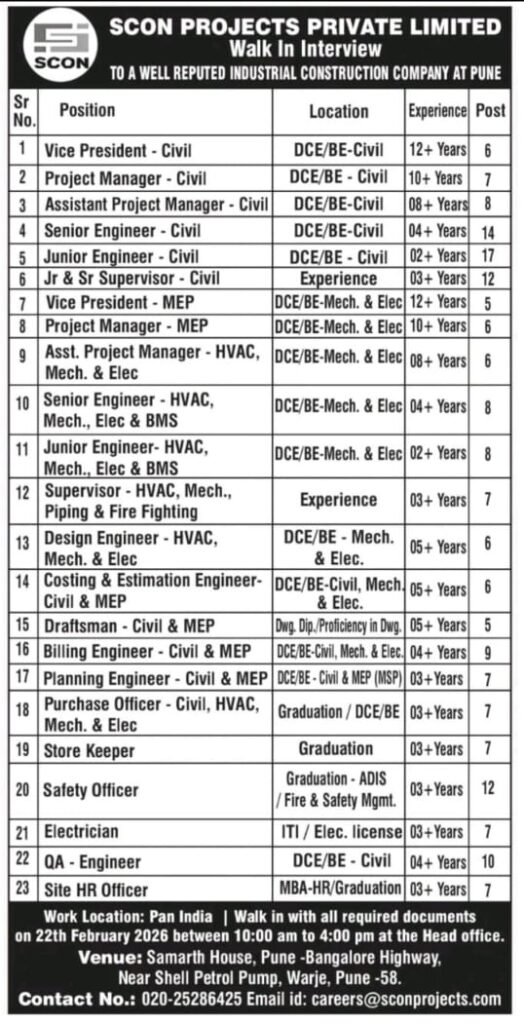 SCON Projects Private Limited is conducting a Walk-In Interview for multiple Civil, MEP, HVAC, QA/QC, Planning, Billing, Safety, and HR