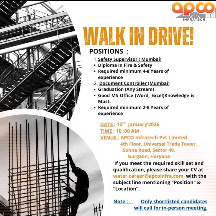 π Interview Type Walk-In Drive π§ Open Positions 1οΈβ£ Safety Supervisor (Mumbai Projects) 2οΈβ£ Document Controller (Mumbai Projects) π Interview