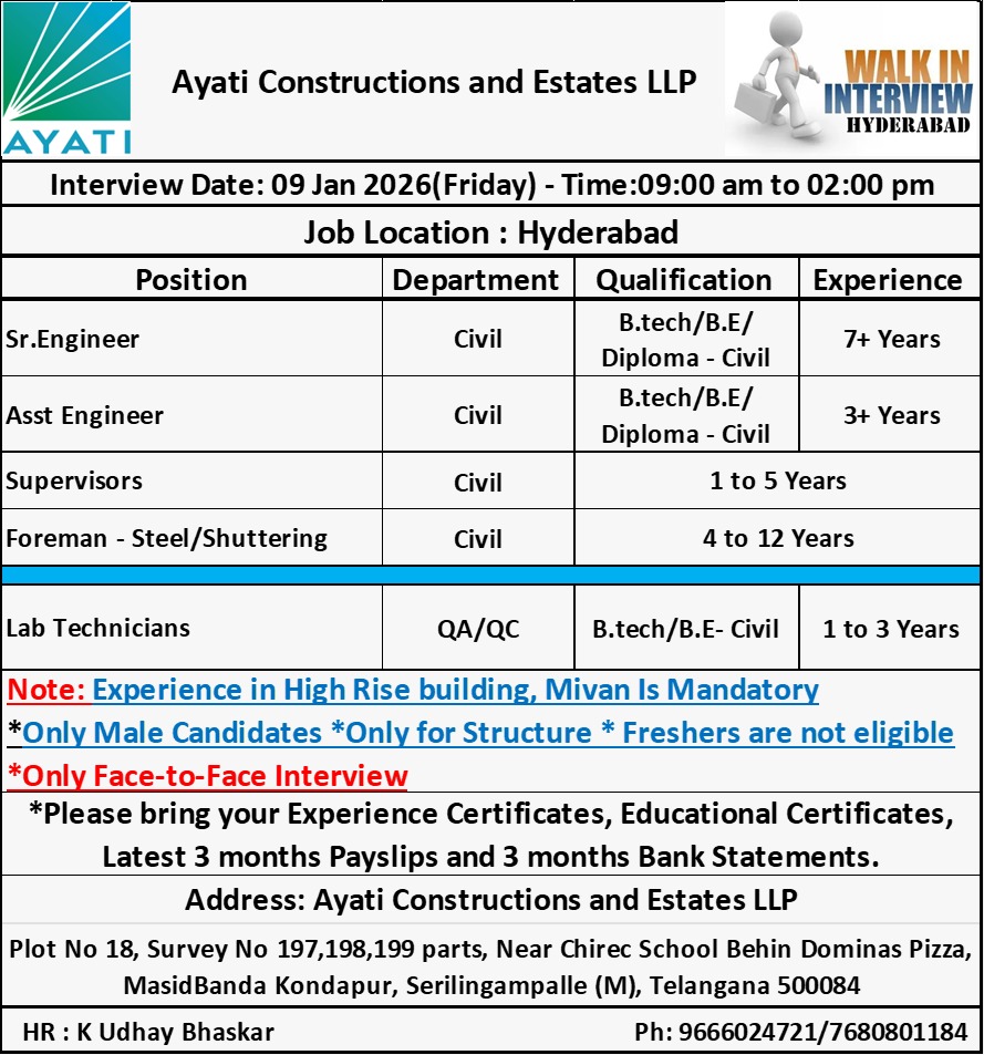 Shared by Civil Jobs Hub verified HR (CJH-HR-004) π’ Company Ayati Constructions and Estates LLP π Interview Schedule π Date: