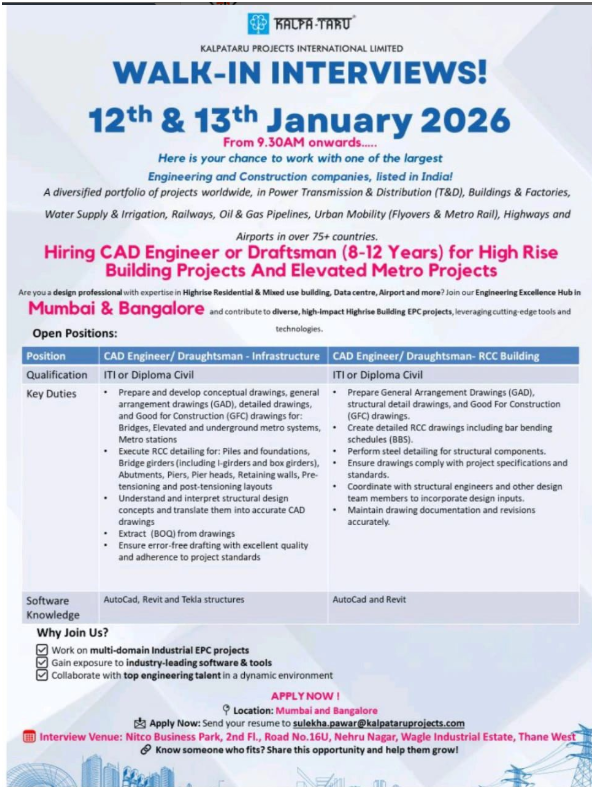 π 12th & 13th January 2026 β° From 9:30 AM onwards π Hiring For CAD Engineer / Draftsman(High-Rise Building Projects