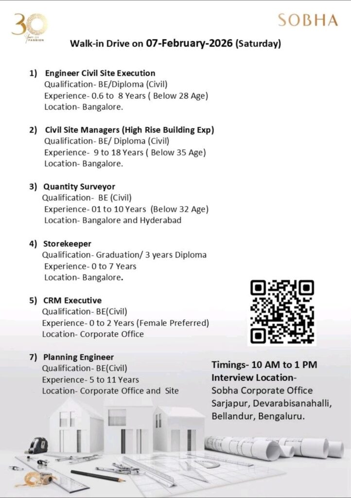 Company: SOBHA LimitedInterview Type: Walk-In Drive 📅 Interview Date:07 February 2026 (Saturday) ⏰ Timings:10:00 AM – 1:00 PM 📍 Interview