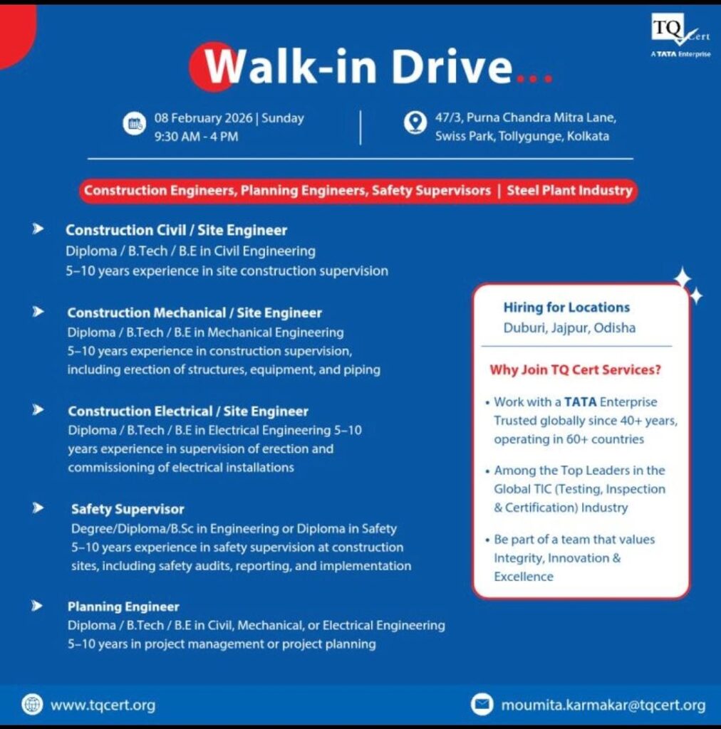 Company Name: TQ Cert Services (A TATA Enterprise)Interview Type: Walk-In Drive – Steel Plant Projects 📅 Interview Date:08 February 2026